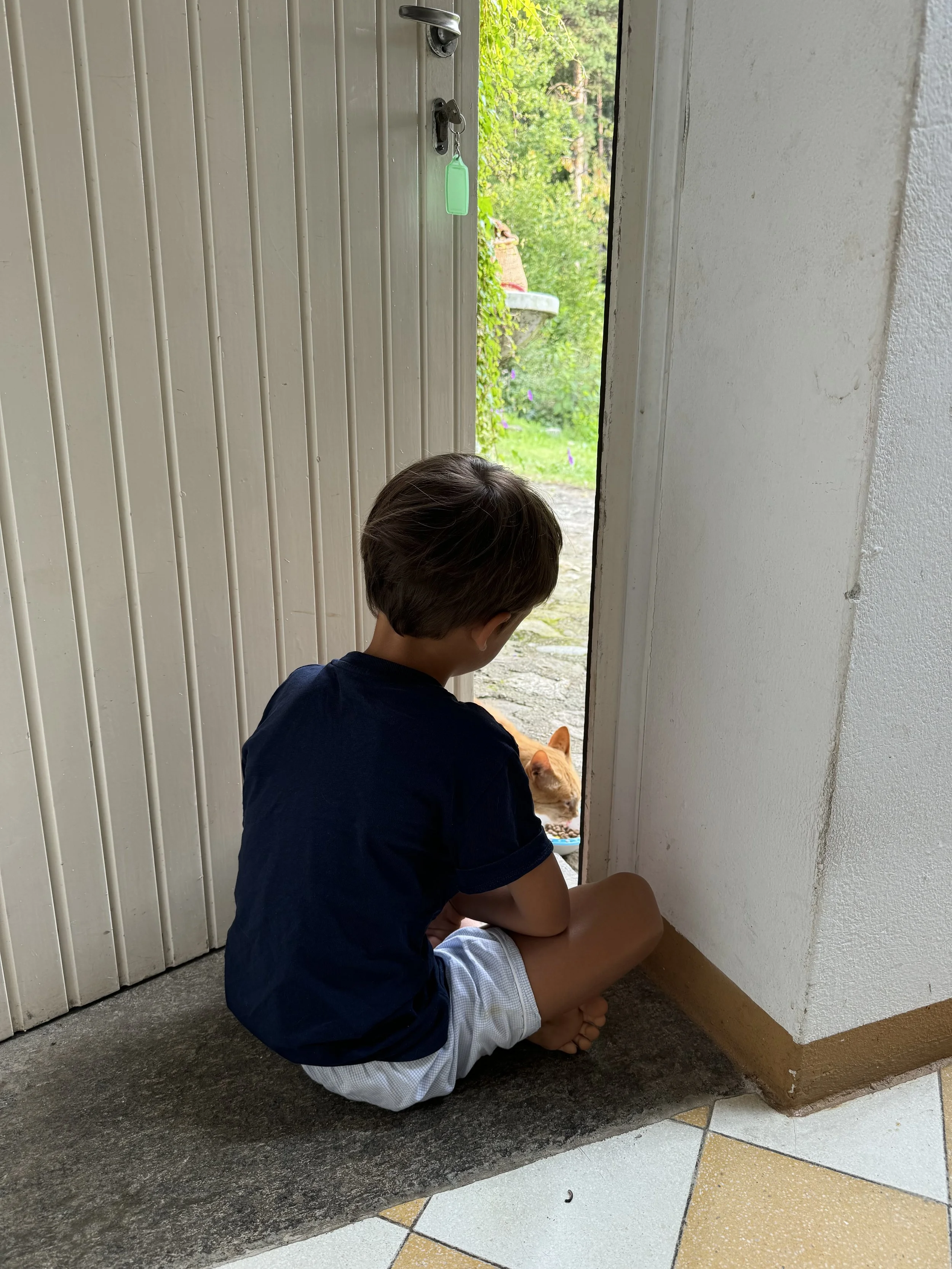 The youngest child had a special bond with the cat, feeding him and watching in quiet fascination, careful not to startle him. In the afternoons, he and I biked together to horseback riding lessons, the wind rushing past us, his excitement evident with each turn of the pedals.